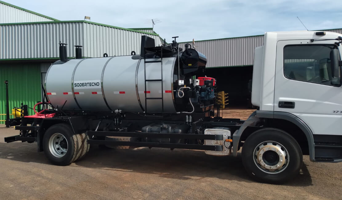 Equipamento para distribuição de cap/asfalto em obras viárias, disponível em diferentes capacidades.